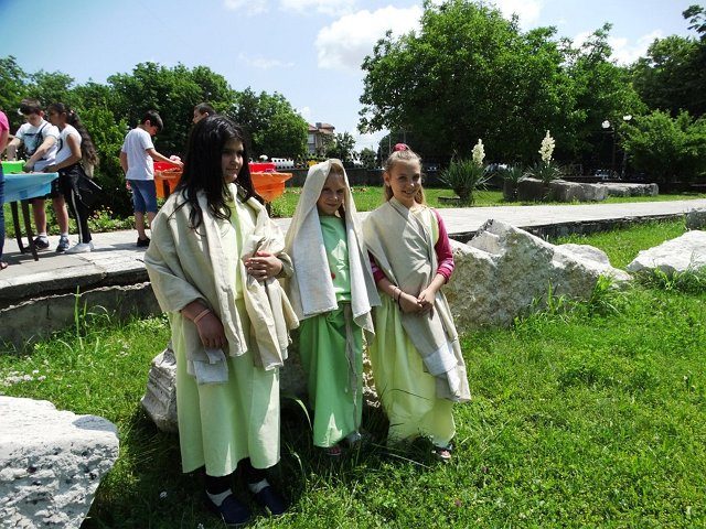 Втората част се проведе в двора на музея, където децата се забавляваха, изучавайки особеностите на професията археолог и се превъплътиха в древни римски граждани, обличайки възстановки на антични туники, тоги и пали.