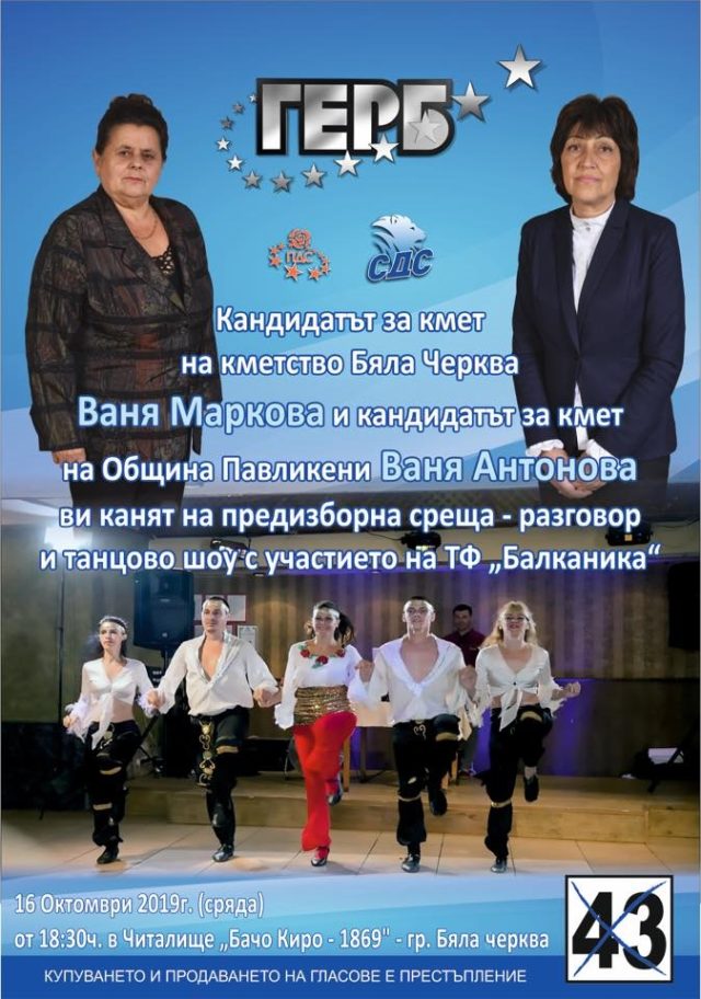 Заповядайте на предизборна среща – разговор и танцово шоу в Бяла черква на 16 октомври, сряда, от 18:30 ч. в залата на НЧ „Бачо Киро – 1869“.