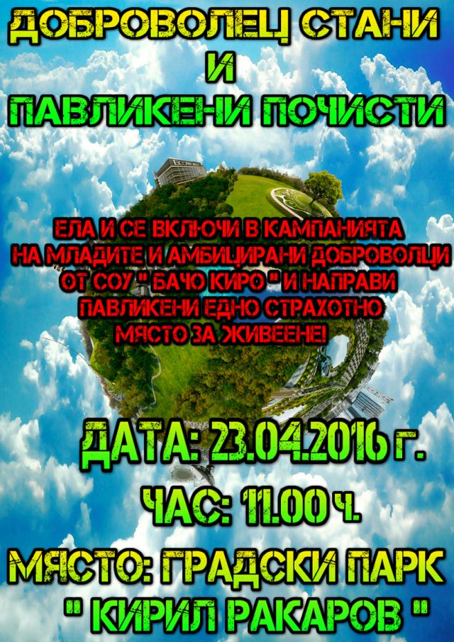 Община Павликени подкрепя младите доброволци от СОУ „Бачо Киро“ за почистване на парковете в града, информираха от кметската администрация. Учениците организират своята акция на 23 април (събота) в 11:00ч. в парк „Кирил Ракаров“. Те приканват повече техни връстници да се включат в акцията под мотото „Доброволец стани – Павликени почисти“.
