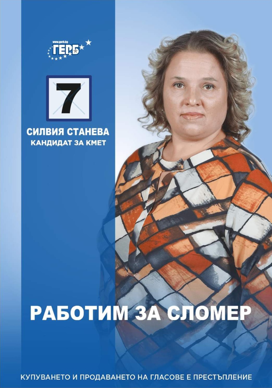Силвия Станева е завършила ВТУ „Св. св. Кирил и Методий“, специалност „Стопанско управление”. Кандидатира се за кмет на с. Сломер, разчитайки на своите доказани през години професионални и лични качества. Работата ѝ в „Български пощи” е изградила у нея уменията да е в постоянен диалог със своите съселяни. Познава прекрасно проблемите на хората, техните радости и неволи, а те ѝ отвръщат с доверие и увереност, че е готова да защити интересите им.