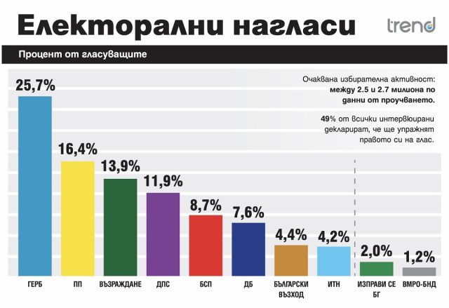 Тренд: ГЕРБ-СДС – 25.7%, ПП – 16.4%, „Възраждане“ трети с 13.9%