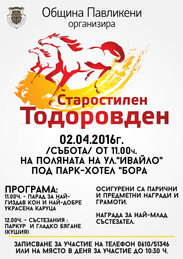 Със състезания по паркур и гладко бягане Павликени ще посрещне Тодоровден, но по стар стил. Две седмици след тазгодишната дата, на 2-ри април в града организират „Старостилен Тодоровден“ – за да не съвпада с местните празници в селата, но и да възроди спомена за силната конна школа в града.